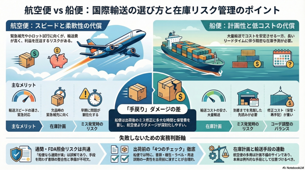 航空便と船便の違いは、コストとスピードという表面的な対比にとどまりません。実務上は「在庫計画への影響」「手戻りの重さ」「通関・照会への耐性」という軸で捉えることが、トラブルを減らすうえで重要です。