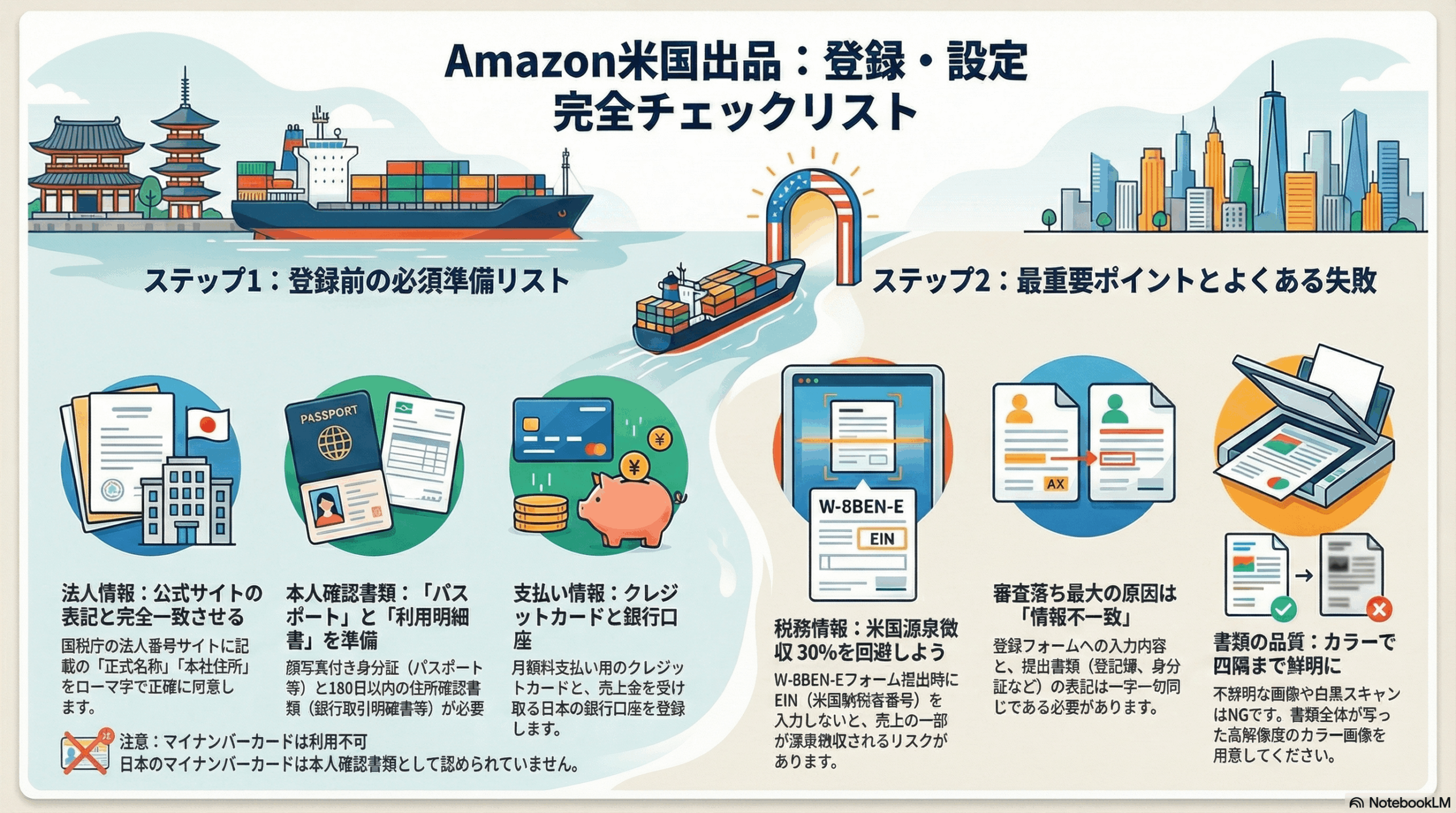 日本企業がAmazon.comで販売を開始するには、法人情報の正確な準備、本人確認書類の適切な提出、W-8BEN-E税務登録の完了、そしてセラーセントラルの初期設定が必要です。特に書類の記載内容と登録情報の一致、EIN取得による源泉徴収リスクの回避、配送方法の適切な選択がアカウント開設成功のカギとなります。