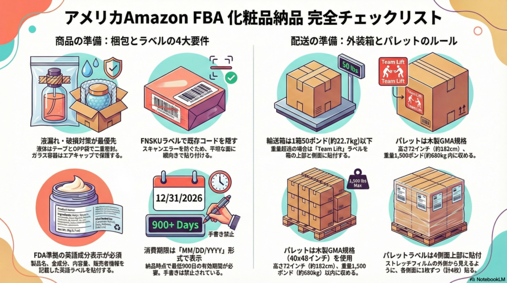 アメリカAmazon FBAで化粧品を成功裏に納品するためには、以下の3つの柱を徹底することが重要です: