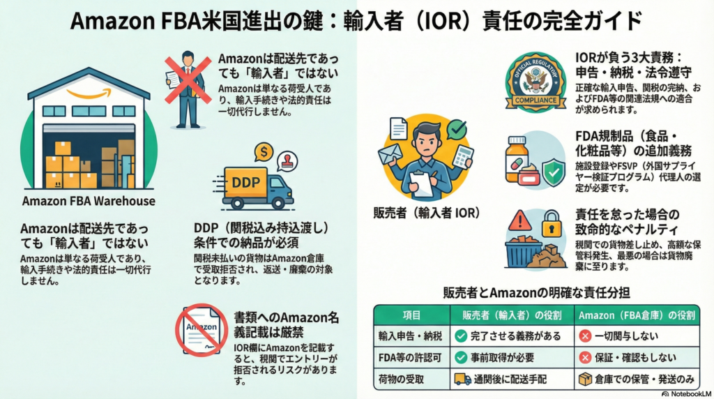 海外から米国のAmazon FBA倉庫へ商品を納品する際、多くの販売者が見落としがちな重要事項があります。それが「Importer of Record(IOR / 輸入者)」の責任です。