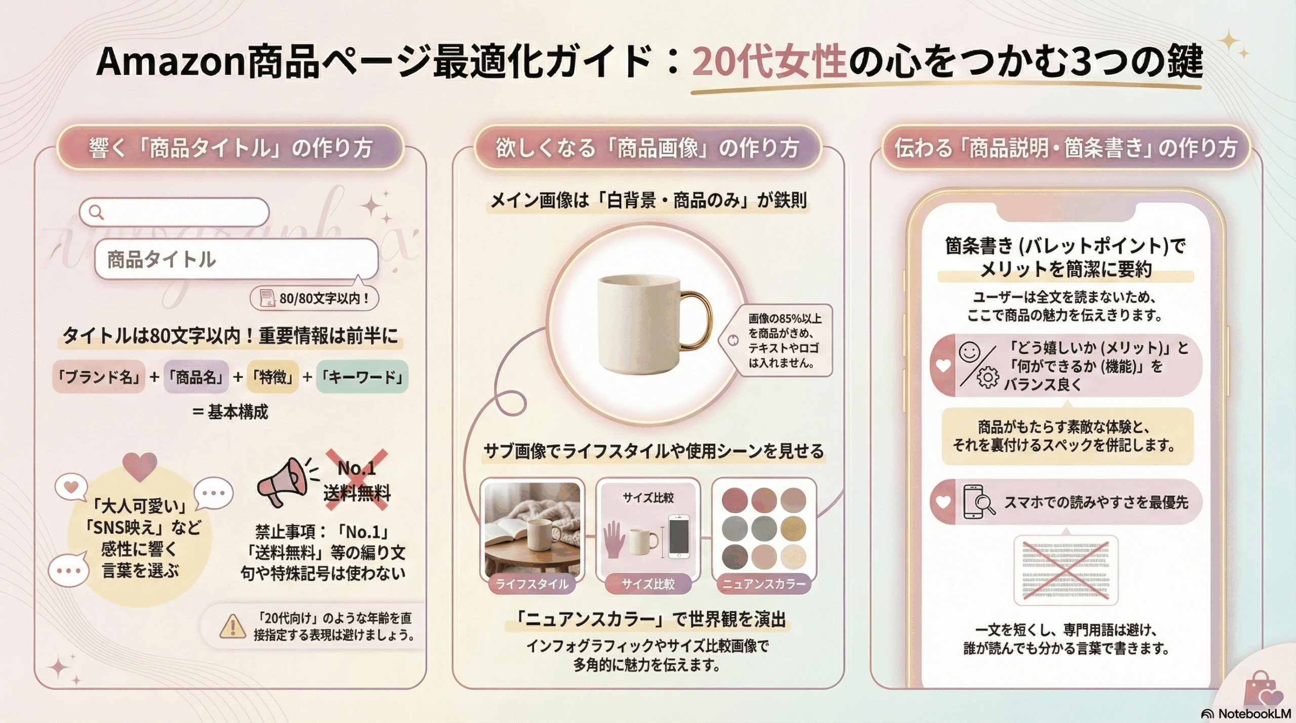 Amazon商品ページの最適化は、単なるSEO対策だけでなく、ターゲットユーザーの心に響くコミュニケーション設計が求められます。20代女性をターゲットとする場合、以下のポイントを押さえることが重要です。