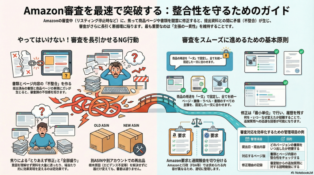 Amazon審査中にやってはいけないことの本質は、「整合性を壊す行動」に集約されます。手当たり次第の修正、場当たり的な表現変更、提出書類と合わないページ更新、別ASINでの回避——これらはすべて、主張の一貫性を崩し、審査を長引かせる方向に作用しやすい行動です。