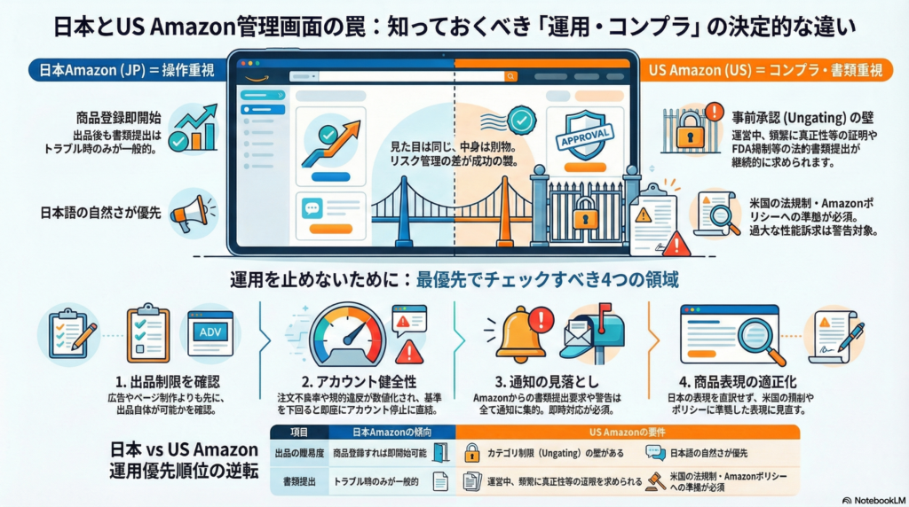 この記事では、日本AmazonとUS Amazonの管理画面の違いを「リスク管理」の観点から整理し、実務でつまずきやすいポイントと事前に知っておくべき考え方を解説します。