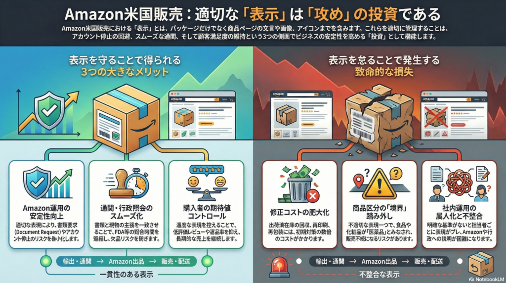 しかし実際には、表示の管理は単なる罰則回避ではなく、Amazon運用・通関・購入者対応をまとめて安定させるための投資として機能します。本記事では、表示を守ることで得られる具体的なメリットと、守らないことで発生しやすい損失を実務目線で整理します。