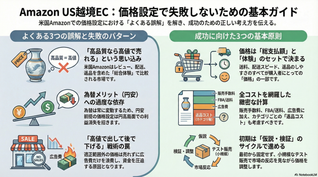 越境ECの価格設定で大切なのは、細かい数字を覚えることではありません。まずは以下の3点が腹落ちすれば十分です。