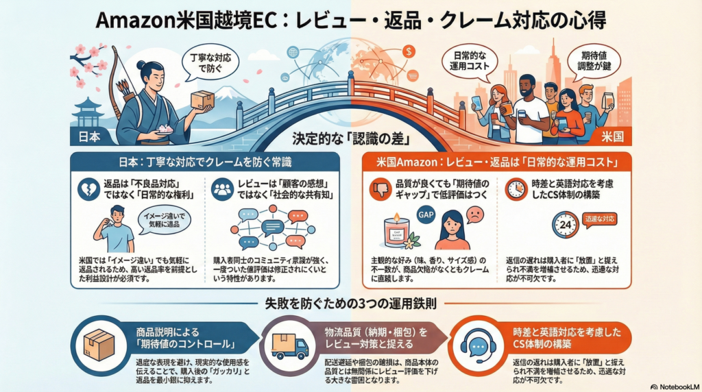 Amazon米国市場への越境ECでは、レビューや返品が日本よりも日常的に発生する文化を前提とした設計が不可欠です。「良い商品なら自然にレビューが増える」「返品は例外的」といった日本的な感覚で参入すると、想定外のコストや運用負荷に直面するリスクがあります。