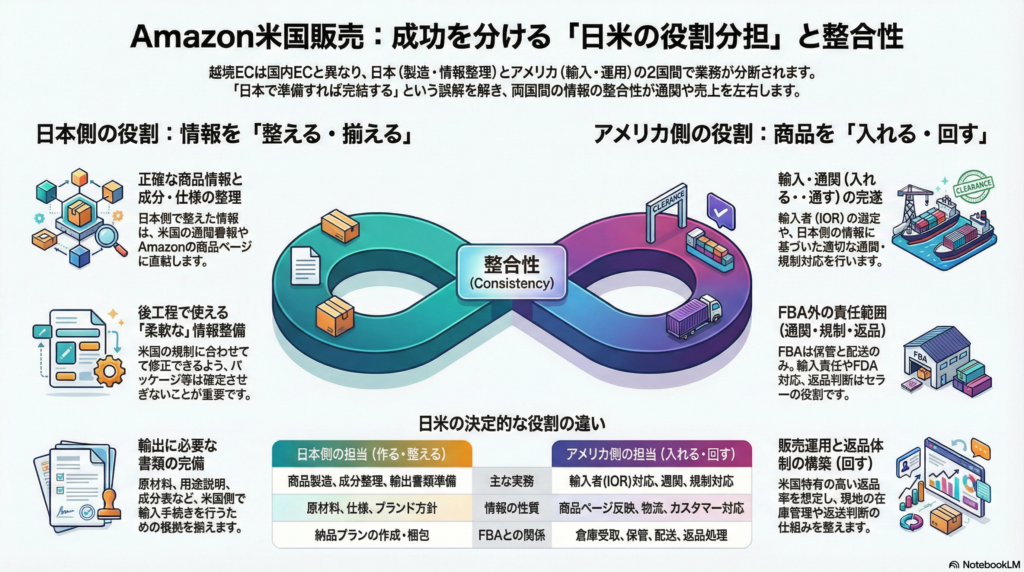 しかし越境ECでは、日本とアメリカという二つの国にまたがって準備が進みます。製造や情報整理は日本側で行い、輸入・通関・倉庫納品・販売運用はアメリカ側で動くという分業が基本です。この「国をまたぐ分業」の構造を理解しないまま進めると、片方の準備不足がもう片方で問題化するケースが頻発します。