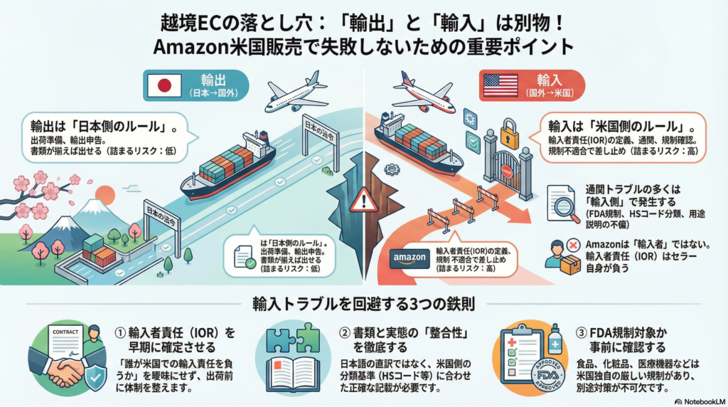 第一に、輸出と輸入は別物であるということ。輸出は日本から出す手続き、輸入は米国に入れて流通させる手続きであり、それぞれに異なる要件と責任が伴う。
