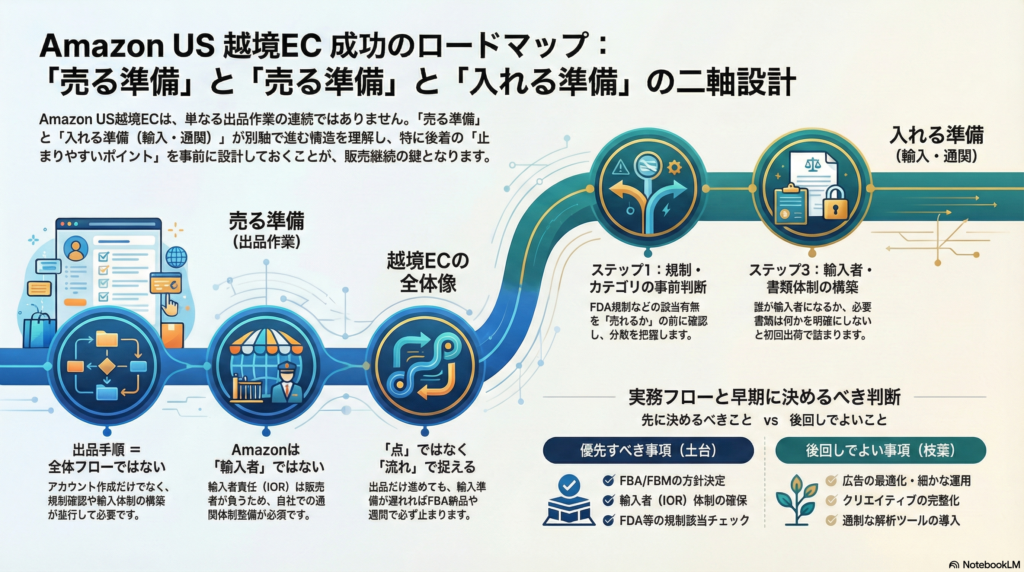 この記事では、Amazon US向け越境ECの全体フローを「出品準備」「輸入・通関準備」「FDA対応」「物流設計」「販売運用」という大きな軸で整理します。どこで何が起き、どこで止まりやすいかを把握することで、無駄な手戻りを最小限に抑えながら販売開始まで進めるための地図を提供します。