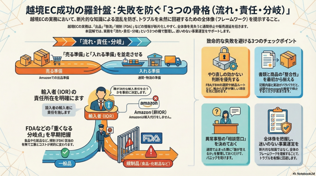越境ECの学習でよくある誤解の一つが、「まとめ部分だけ読めば、細部は必要なときに調べればいい」という考え方だ。しかし、越境ECでは複数の関係者(Amazon、物流会社、通関業者、規制当局、自社)が絡み合っており、各段階でどこが何を担うかを把握していないと、問題が起きたときに原因の切り分けができない。