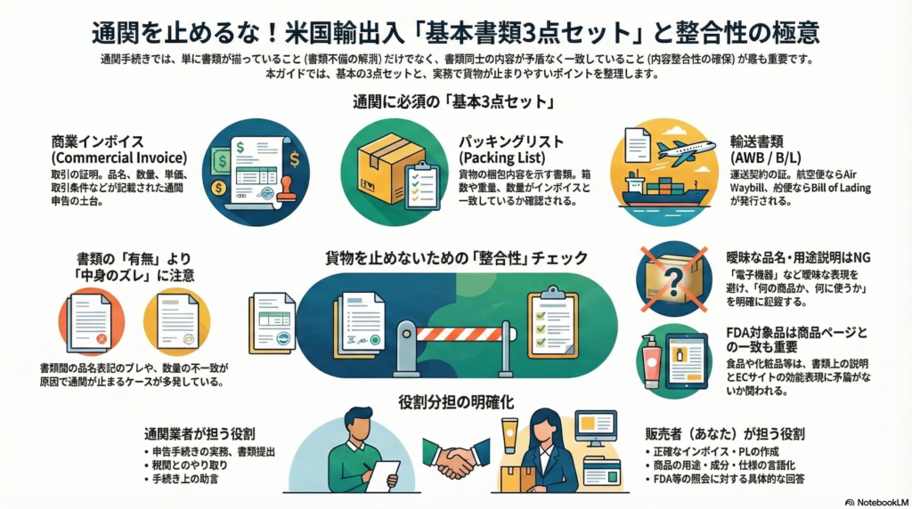 越境EC・輸入ビジネスに初めて取り組む人が最初につまずくポイントの一つが、通関書類です。「インボイスを用意すれば大丈夫」という思い込みで進んでしまい、書類の不備や内容の不一致によって貨物が通関で止まってしまうケースは少なくありません。