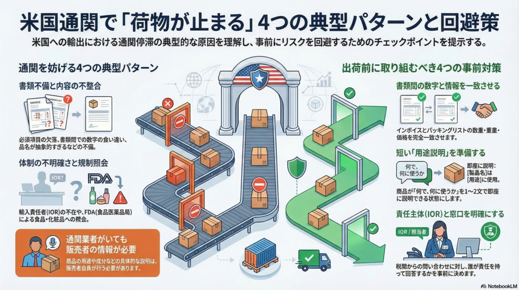 - 通関業者がいても、商品情報は販売者側が出せないと進まないことがある → 「任せているから大丈夫」という前提を見直すきっかけになります