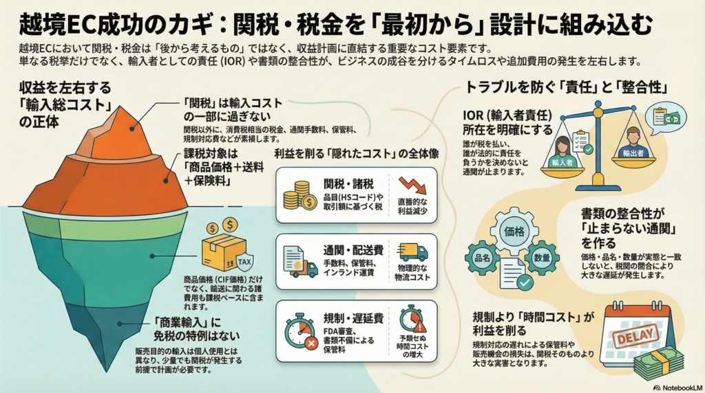 越境ECにおける関税・税金は、後から発覚して驚くべきものではなく、輸入コストの一部として最初から収益設計に組み込むべき要素です。