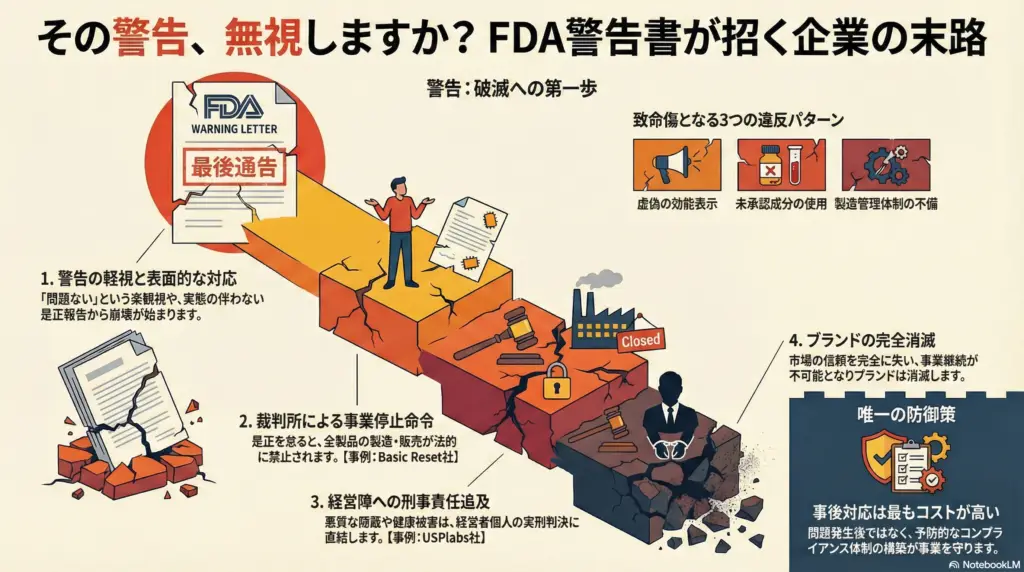 FDA Warning Letterへの対応は、単なる法令遵守の問題ではありません。それはブランドの存続、従業員の雇用、経営者の人生に直結する重大事項です。