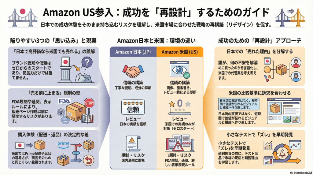 日本での販売実績や商品力は、Amazon USへの参入において「ゼロからではなく、学びを持って挑戦できる」という意味での資産になります。しかしそれは、そのまま通用するという保証ではなく、再設計のための出発点として活用するものです。