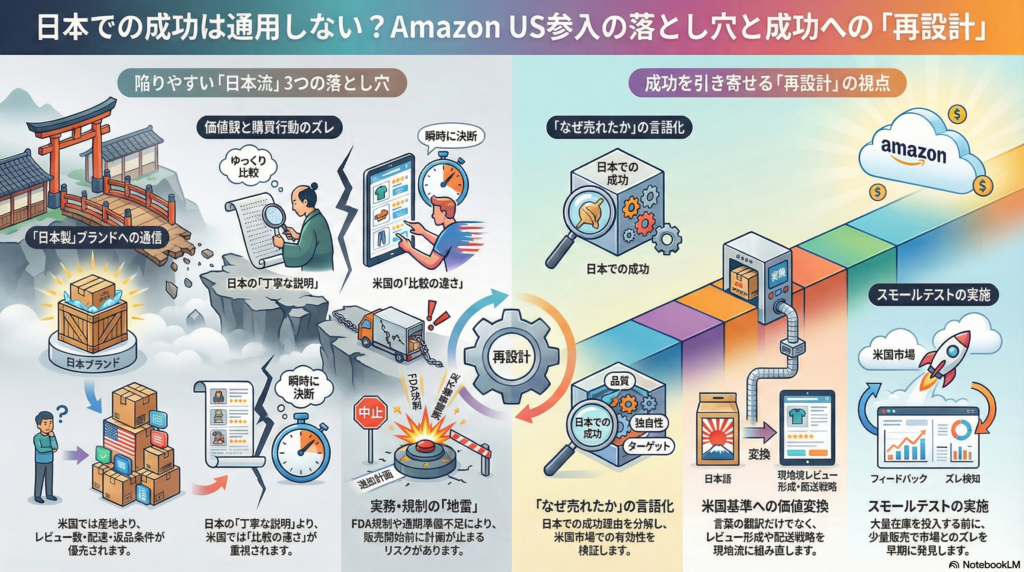 日本での成功体験は貴重な資産ですが、それをそのままAmazon USに持ち込むことは、むしろリスクを高める可能性があります。