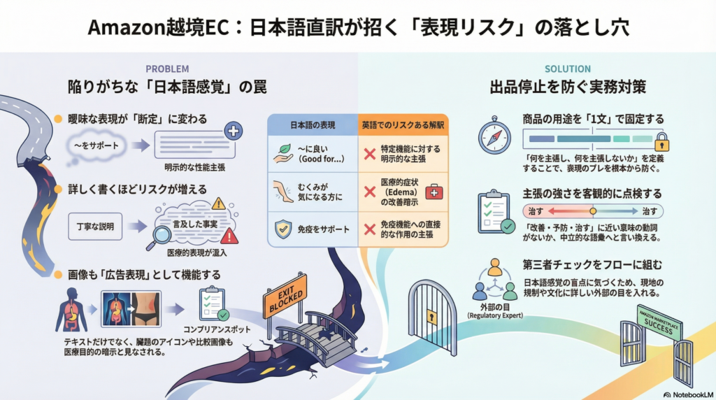 Amazon越境ECにおける表現リスクの本質は、英語力の問題ではありません。「日本語で問題ない表現が、英語圏では断定・効能・医療目的の主張に見える」という構造的なズレを認識しているかどうかが、実務上の分かれ目になります。