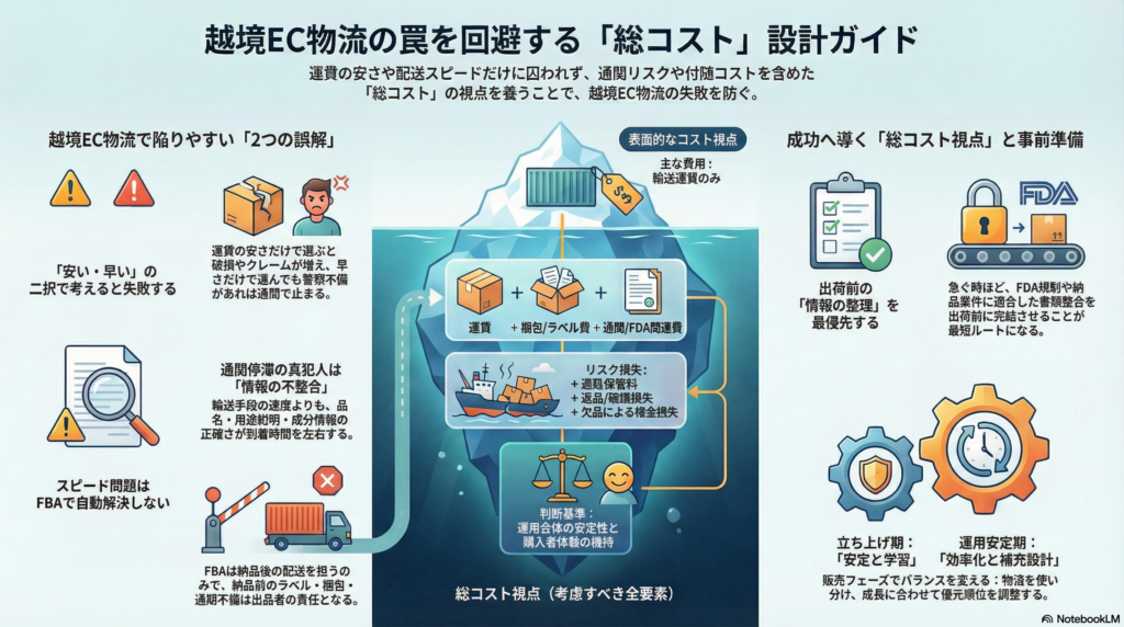越境ECの物流コスト・スピードバランスの判断は、運賃の比較だけでは完結しない。通関・FBA納品要件・書類整合・欠品リスクまで含めた総コスト視点と、販売フェーズに合わせた設計の切り替えが、実務上の判断精度を上げやすい。