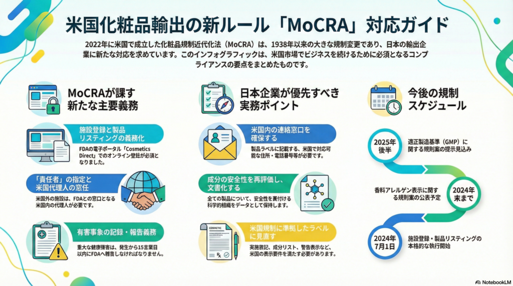 MoCRAの成立により、米国化粧品市場における規制環境は大きく変化しています。日本の小規模化粧品ブランドが米国市場に参入する際には、施設登録・製品リスティング、責任者の指定、アレルゲン表示、GMP対応、有害事象報告など、多岐にわたる新規要件への対応が必要です。