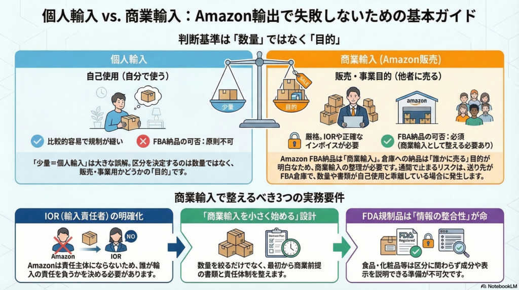 • Amazon販売前提の輸入(FBA納品含む)は、多くの場合商業輸入として整理が必要になりやすい