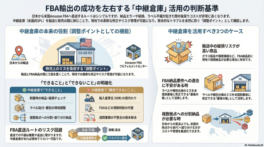 • 中継倉庫は「余計なコスト」ではなく、検品・再作業・FBA要件合わせ込みの調整ポイントとして機能しやすい