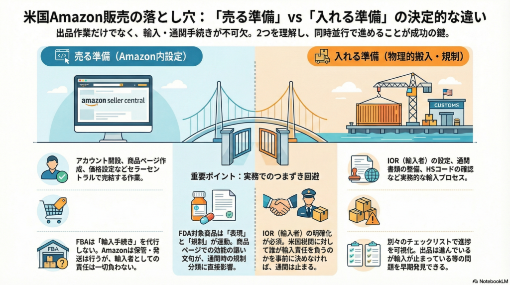 ① 売る準備と入れる準備は別物である Amazon上の販売設定(売る準備)と、米国への輸入・通関・規制対応(入れる準備)は別のプロセスです。どちらかが欠けると、販売開始や継続のどこかで止まる可能性があります。