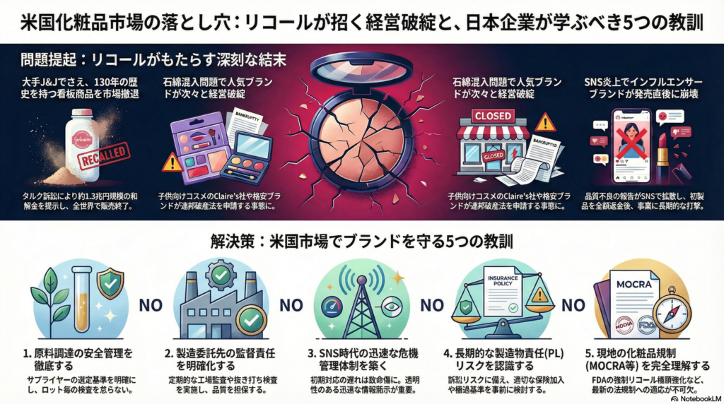 アメリカ市場における化粧品リコールは、単なる製品回収では終わりません。消費者からの信頼失墜、高額な賠償訴訟、そして最悪の場合は企業の倒産や市場撤退という深刻な結果を招いています。
