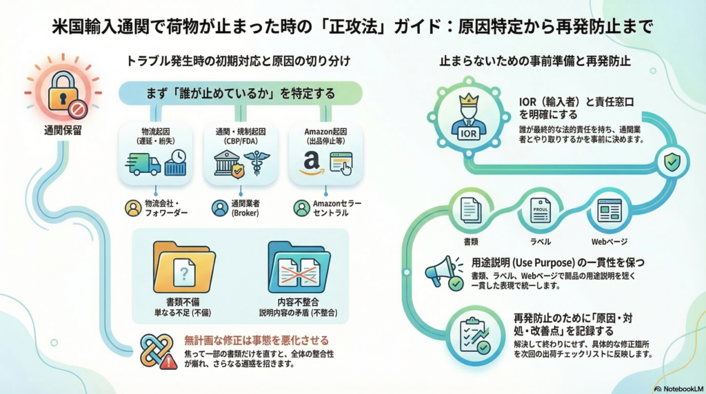 通関で止まったときに大切なのは、パニックで動き出す前に「誰が止めているか」を切り分けることだ。物流・CBP・FDA・Amazonの4つのどこに原因があるかで、対応の窓口も方法もまったく異なる。