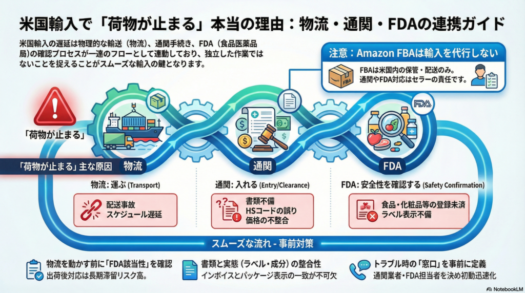 1. 物流は「運ぶ」、通関は「入れる」、FDAは「該当時に輸入段階で確認が入る可能性がある」